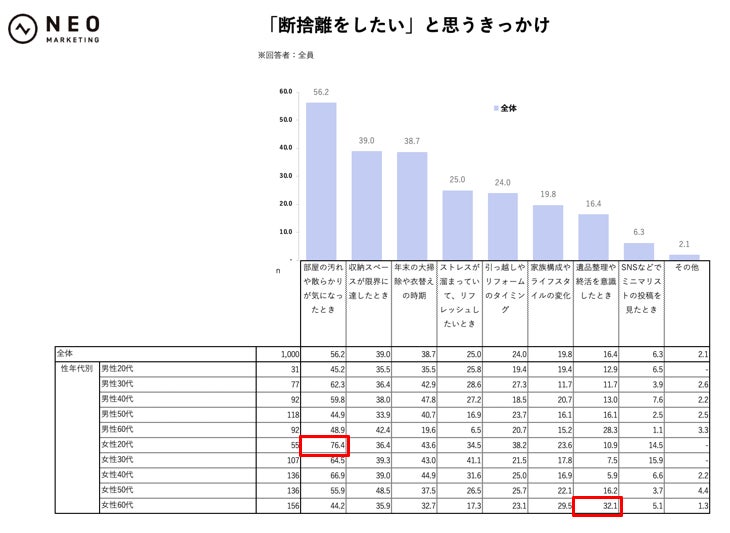 全体では、「断捨離をしたい」と思うきっかけとして「部屋の汚れや散らかりが気になったとき」が56.2%で突出しており、「収納スペースが限界に達したとき」が39.0%、「年末の大掃除や衣替えの時期」が38.7%と続きました。