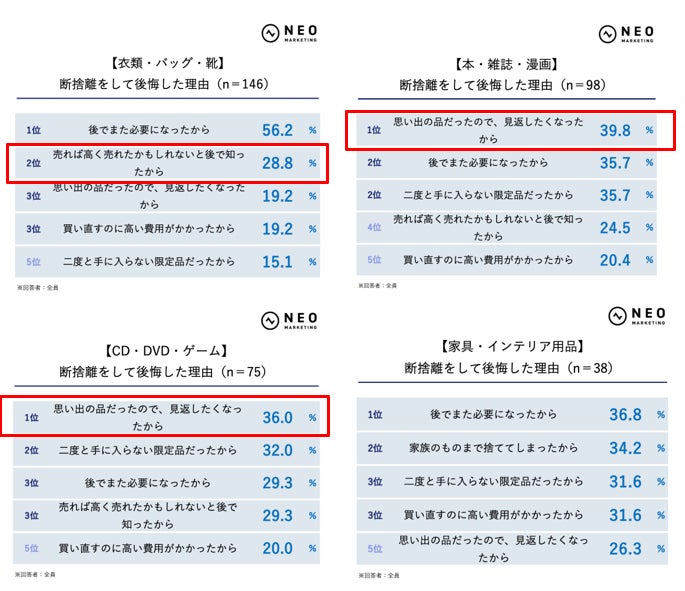 後悔したものがあると回答した人に対し、断捨離をして後悔した理由について質問されました。以下は、各ジャンル(n=30以上)のTOP5までをランキング化したものです。