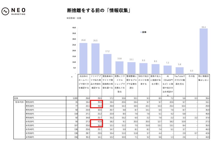 全体の約60%は、断捨離前に何らかの下調べをしていることが明らかになりました(「特に情報収集はしない」が39.4%)。その中では「自治体のホームページで捨て方を確認する」が26.8%でトップでしたが、性年代別に見ると20代から30代では「フリマアプリで似た商品の売値を確認する」が強く、女性20代で41.8%、男性30代で39.0%、女性30代で34.6%、男性20代で35.5%と高水準でした。