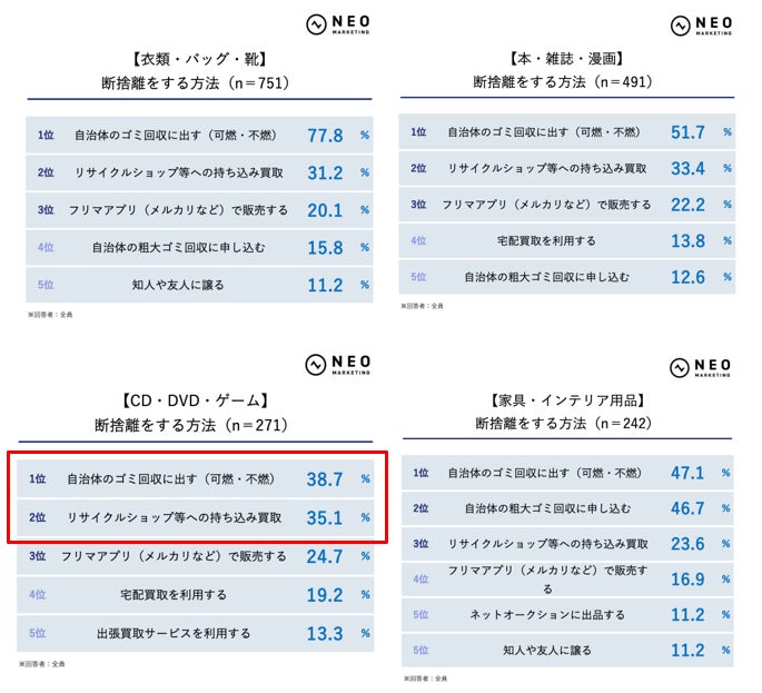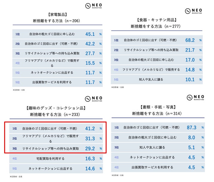 一方で、売却・買取行動が迫るジャンルもあります。例えば、CD・DVD・ゲームは自治体回収が38.7%に対しリサイクルショップ持ち込みが35.1%、趣味のグッズ・コレクション品も自治体回収が41.2%に対し、フリマアプリが31.3%、持ち込み買取が29.2%でした。