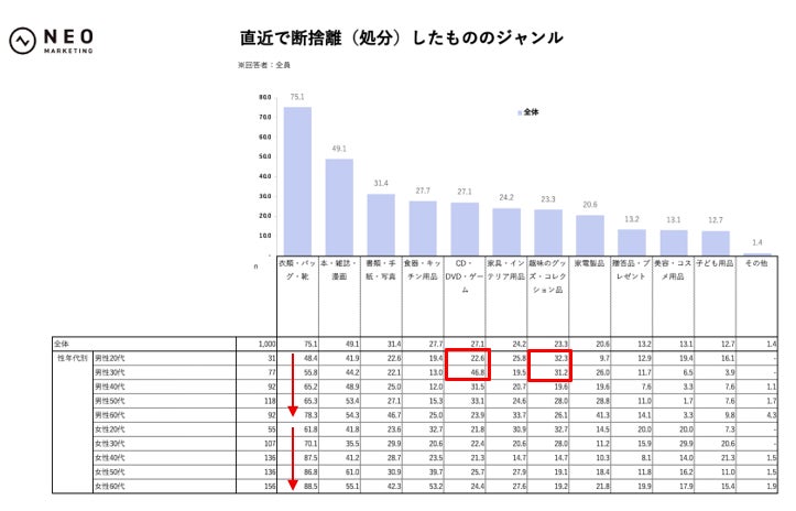 性年代別に見ると、衣類系はおおむね年代が上がるほど高まり、女性40代で87.5%、女性50代で86.8%、女性60代で88.5%と特に高水準でした。一方で若年男性は処分ジャンルがやや異なり、男性30代では「CD・DVD・ゲーム」が46.8%、男性20代では「趣味のグッズ・コレクション品」が32.3%と目立っています。
