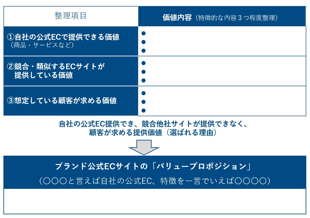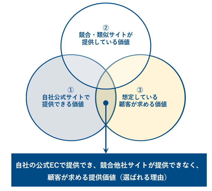 ①②③の内容を踏まえて、自社の公式ECで提供でき、競合他社サイトが提供できない、顧客が求める提供価値を明確にします。