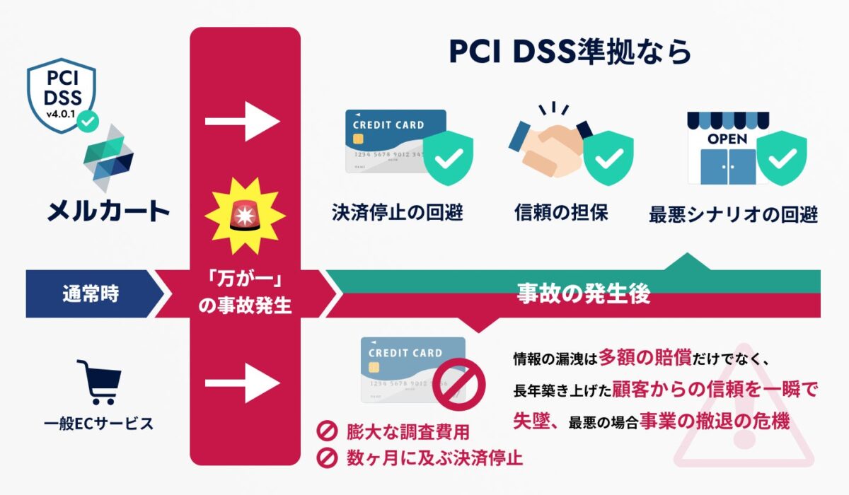 ECサイトにおいて、もし情報漏洩などのセキュリティインシデントが発生してしまった場合、クレジットカード決済の継続や再開を行うためには、PCI DSS準拠が条件として求められるケースがあります。企業が自社でこうした事後対応を実施するには、莫大な調査コストと、状況によっては数か月間にわたる決済機能の停止を伴うことがあり、事業の存続自体が脅かされる可能性があります。