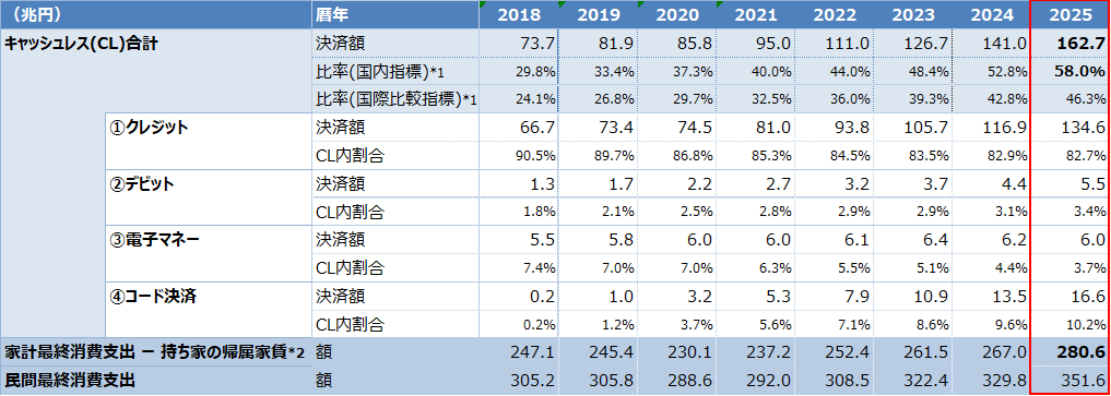 2025年のキャッシュレス決済比率は58.0%、決済額は162.7兆円に