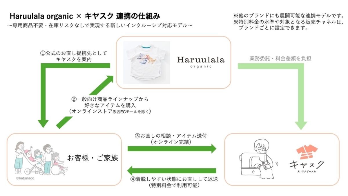 今回の提携により、Haruulala organicの商品を購入しようとする顧客は、障害や病気などで衣服の着脱に困難がある場合でも、購入後にキヤスクでお直しができることを前提に、商品を選びやすくなります。これまで「着たいけれど、自分には着にくいかもしれない」「プレゼントしたいけど、相手には着にくいかもしれない」と感じて購入をためらっていた顧客が、諦めずにHaruulala organicの商品を選択できるようになります。