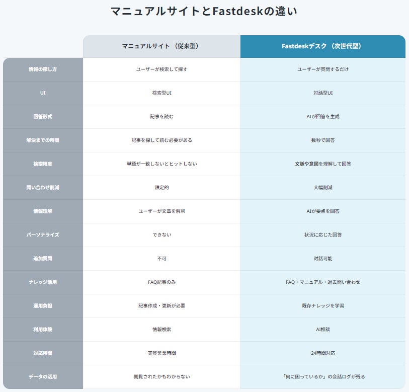 Fastdesk(ファストデスク)は、こうした従来型マニュアルサイトの限界を超えて、「顧客が質問するだけで答えが返ってくる」対話型AIサポートへの転換を実現するために開発されました。