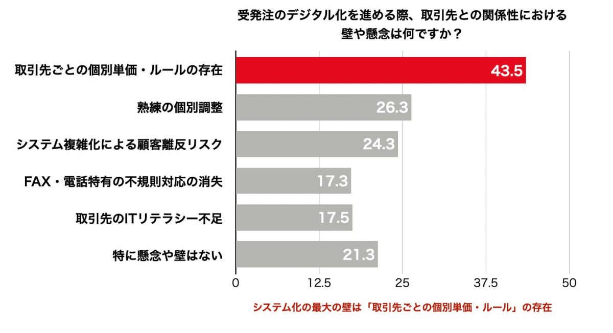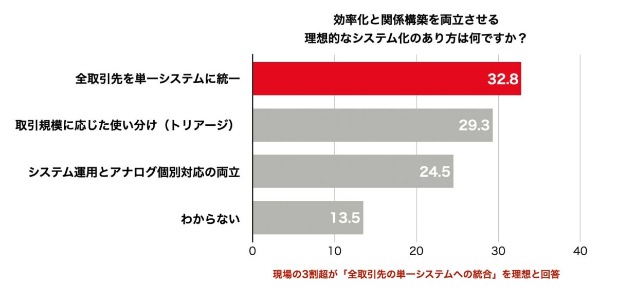 調査結果から、理想と現実の大きなギャップが明らかになっています。現場担当者の32.8%が「単一システムへの統一」を理想的だと考えている一方で、システム化を進める上での最大の障壁として「取引先ごとの個別ルール(43.5%)」が最も多く挙げられました。