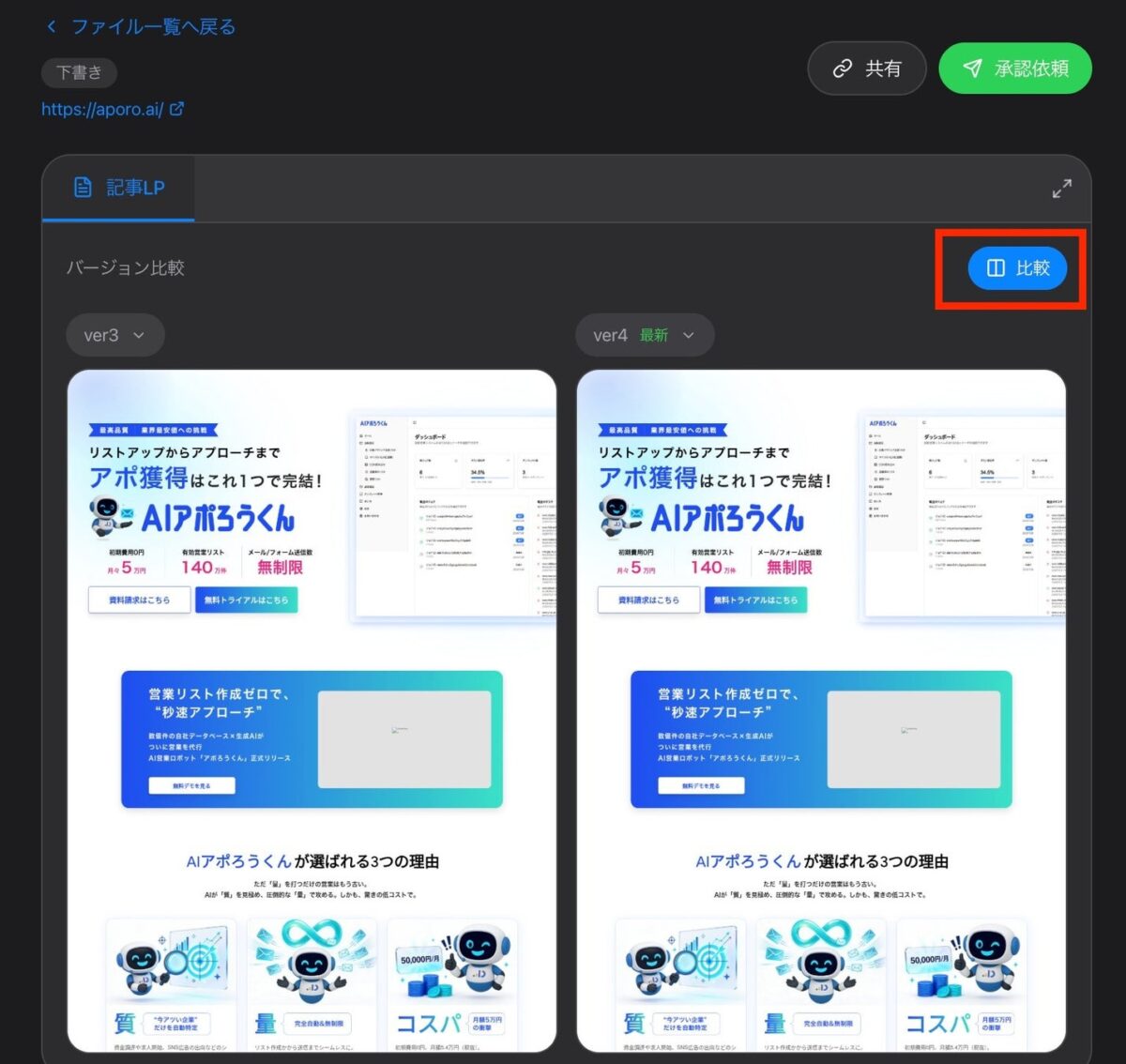 修正前と修正後のCRを並べて比較する機能が実装されています。動画については同じタイムコードで並列再生が可能となっており、修正内容の反映漏れや意図していない変更を一目で発見することができます。