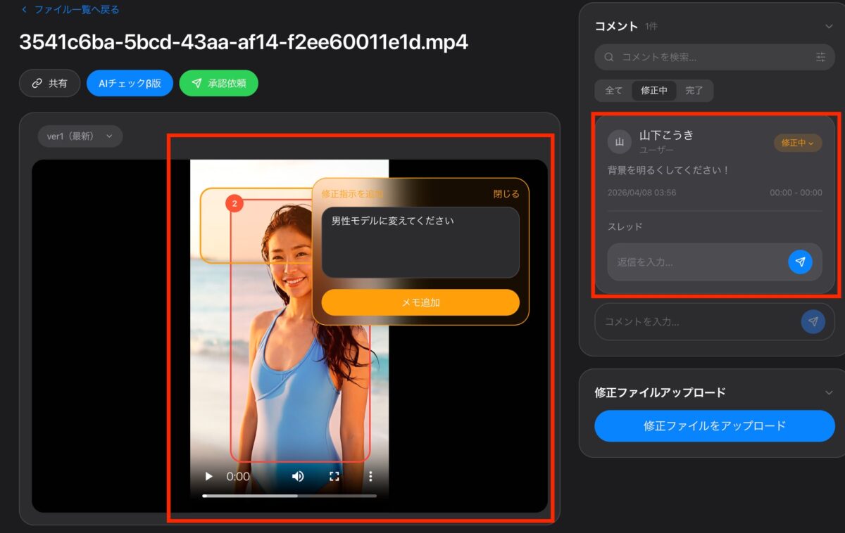 特に問題となっているのは、修正に関する指示がメール・チャット・スプレッドシートといった複数のツールに分散してしまい、「誰がどのタイミングでどのような指示を出したのか」が追跡できなくなる状況です。動画CRにおいては「何分何秒の該当カットを修正してほしい」といった具体的な指示をテキストのみで伝達するのは困難であり、認識の相違が修正回数の増加を招く要因となっていました。