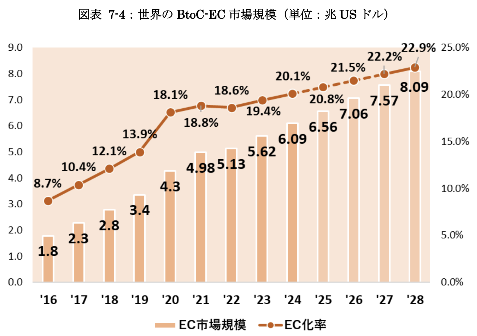 経済産業省の調査によると、世界のBtoC-EC市場は2016年の約1.8兆ドルから拡大を続け、2028年には約8兆ドル規模に達すると予測されています。EC化率も年々上昇しており、オンライン購買は世界の消費行動の中で重要な位置を占めるようになっています。