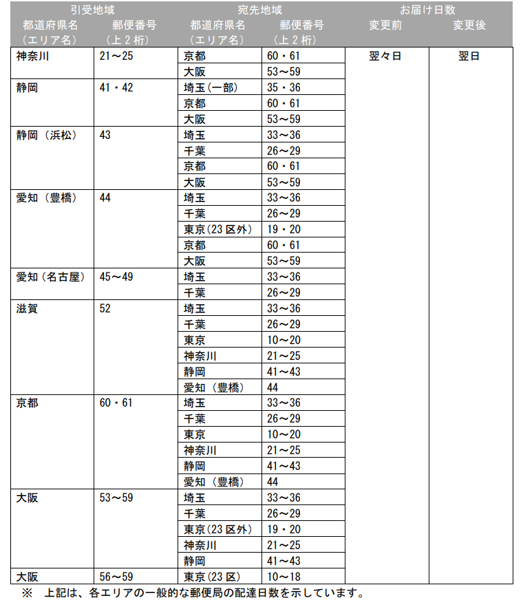 別添資料によると、今回の見直しは、首都圏から東海・関西方面への一部配送、また東海・関西から首都圏方面への一部配送を中心に行われます。たとえば、埼玉県や千葉県から静岡県浜松エリア、愛知県の一部、京都府の一部、大阪府の一部へ差し出すケースや、神奈川県、静岡県、愛知県、滋賀県、京都府、大阪府の一部から首都圏方面へ差し出すケースなどで、従来の翌々日配達が翌日配達へと変わります。