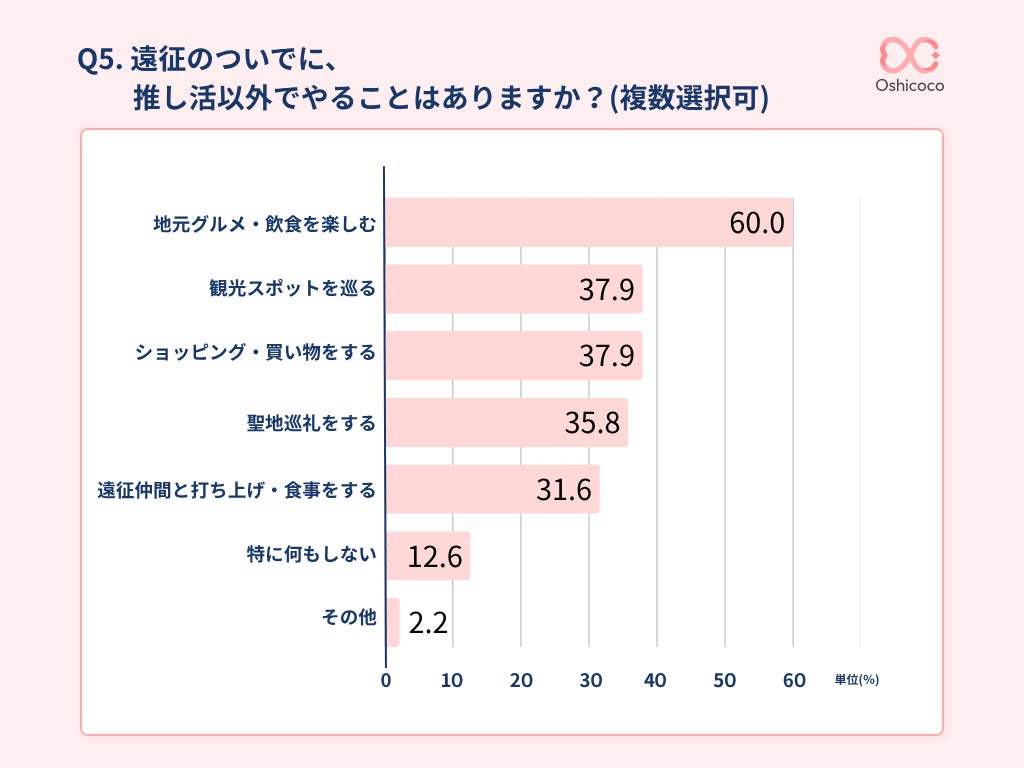 遠征のついでに推し活以外でやることを複数回答で聞いたところ、最も多かったのは「地元グルメ・飲食を楽しむ」で60.0%でした。
