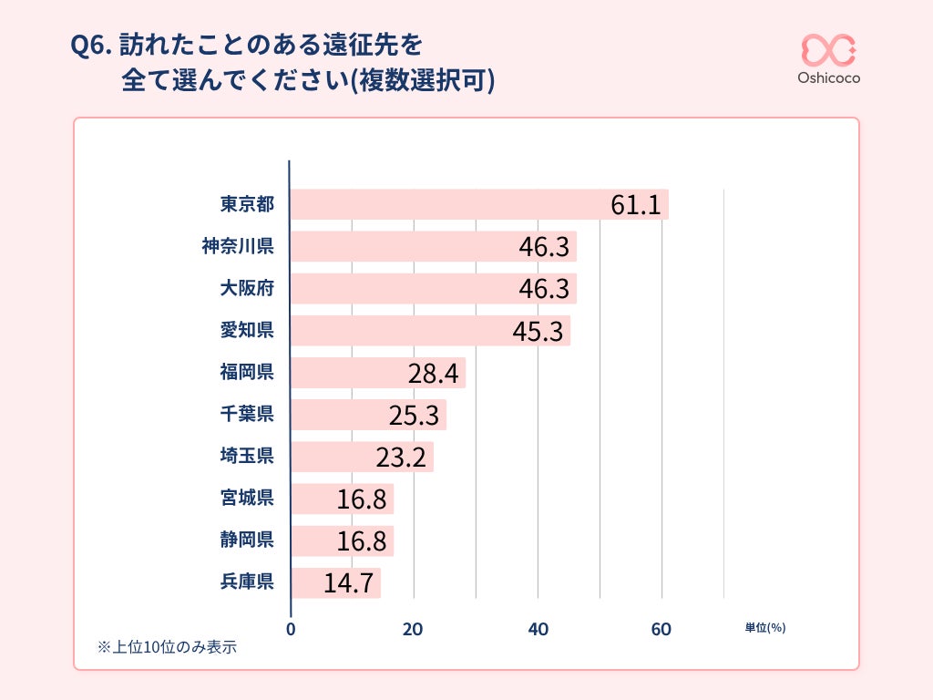 遠征経験のある地域を聞いたところ、東京都が61.1%で最多となり、次いで神奈川県・大阪府が各46.3%、愛知県が45.3%と続きました。