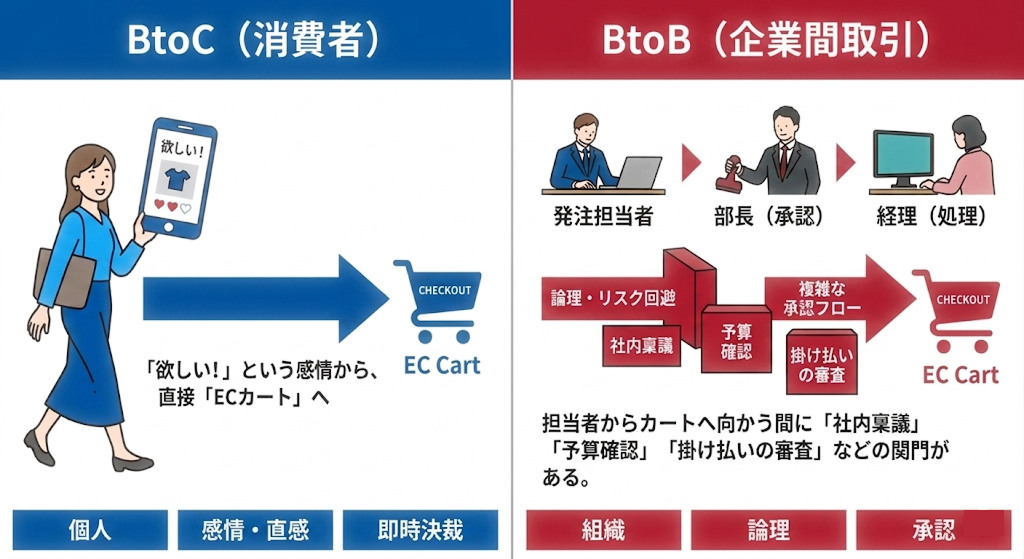 BtoCとBtoBでは、購買の動機や意思決定の構造が根本的に異なります。