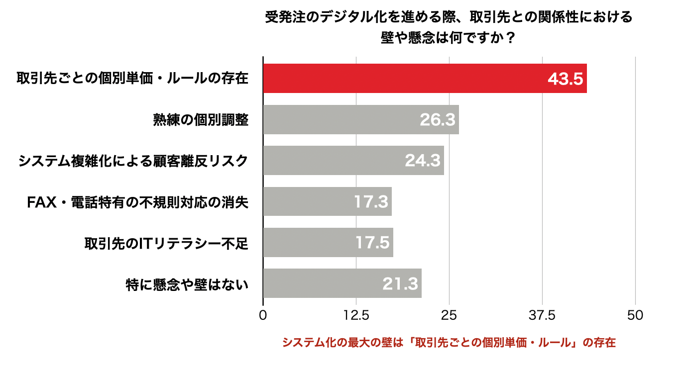 受発注のデジタル化を進める際の壁や懸念についての調査では、「取引先ごとの個別単価・ルールの存在(43.5%)」が最多となりました。次いで「システム複雑化による顧客離反リスク(24.3%)」、「FAX・電話特有の不規則対応の消失(17.3%)」などが上位に挙がっています。