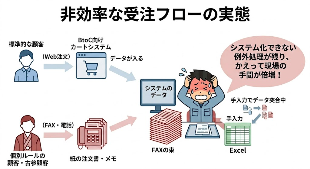 複雑な商慣習を持つすべての取引先を、単一のカートシステムに無理に押し込めようとすると、どのような事態に陥るでしょうか。