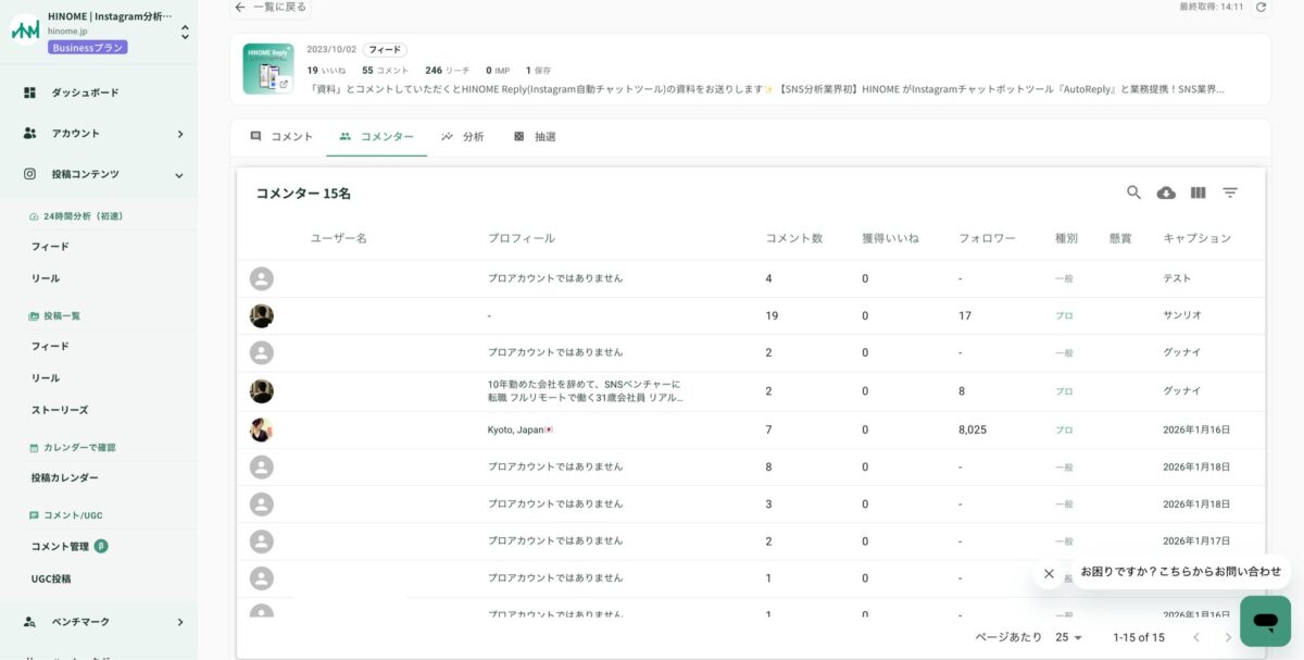 - プロフィール属性分析では、コメント主のプロフィール情報までHINOME上で把握することが可能です。フォロワー数やバイオグラフィから「マイクロインフルエンサー」や「コアファン」を特定し、ターゲティングの精度を向上させます。