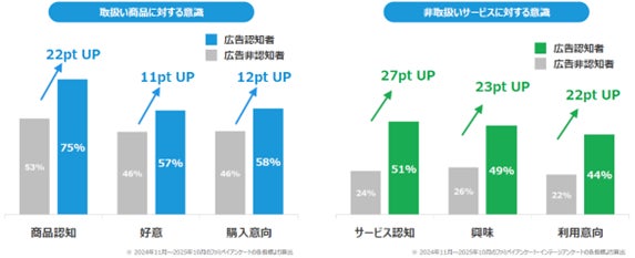 一方、ファミリーマート非取扱いサービスに関する調査においても、広告接触者のスコアは非接触者を大幅に上回りました。認知で+27ポイント、興味関心で+23ポイント、利用意向で+22ポイントの差が見られています。