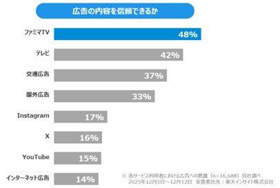 社会インフラとも言えるコンビニエンスストアの信頼性の高さが影響し、「広告の内容を信頼できるか」というアンケート調査において、テレビ(41.9%)を上回る47.7%という高い信頼性を獲得しています。