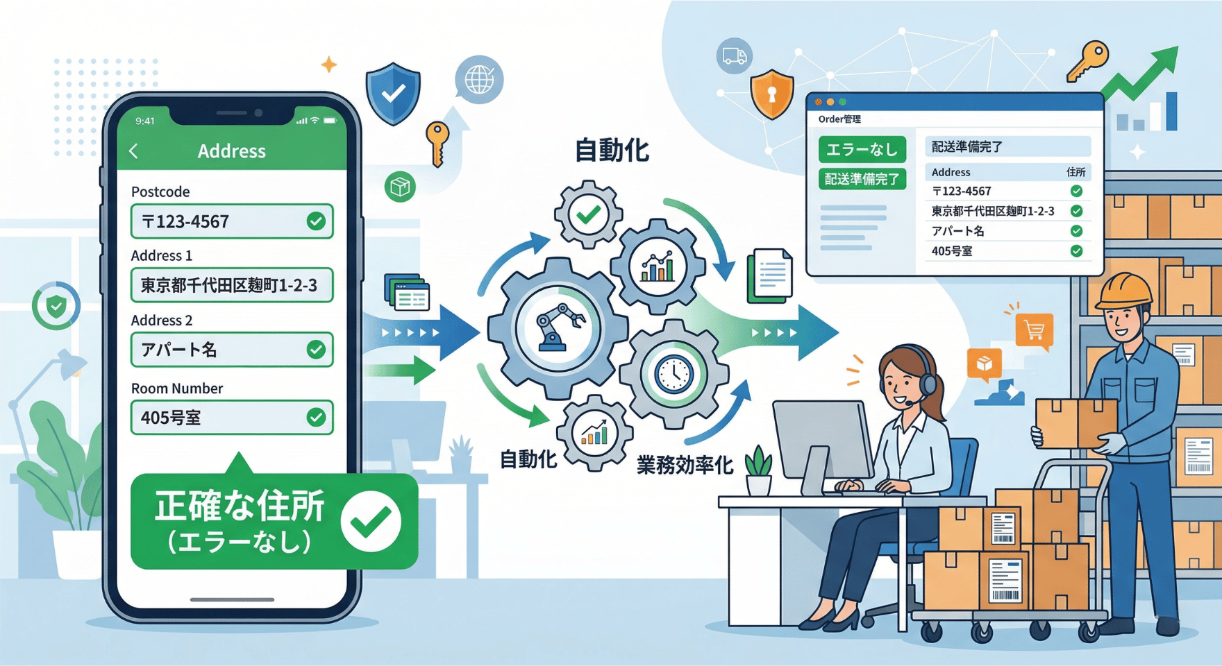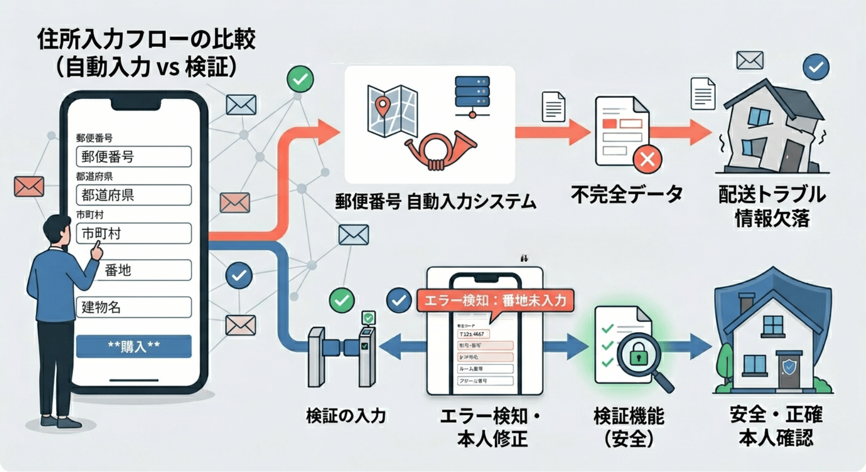 誤配送を防ぎながら安全性も高めるには、システムが自動で書き換えるのではなく、入力時に不備を知らせる「検証(バリデーション)」の考え方が有効です。