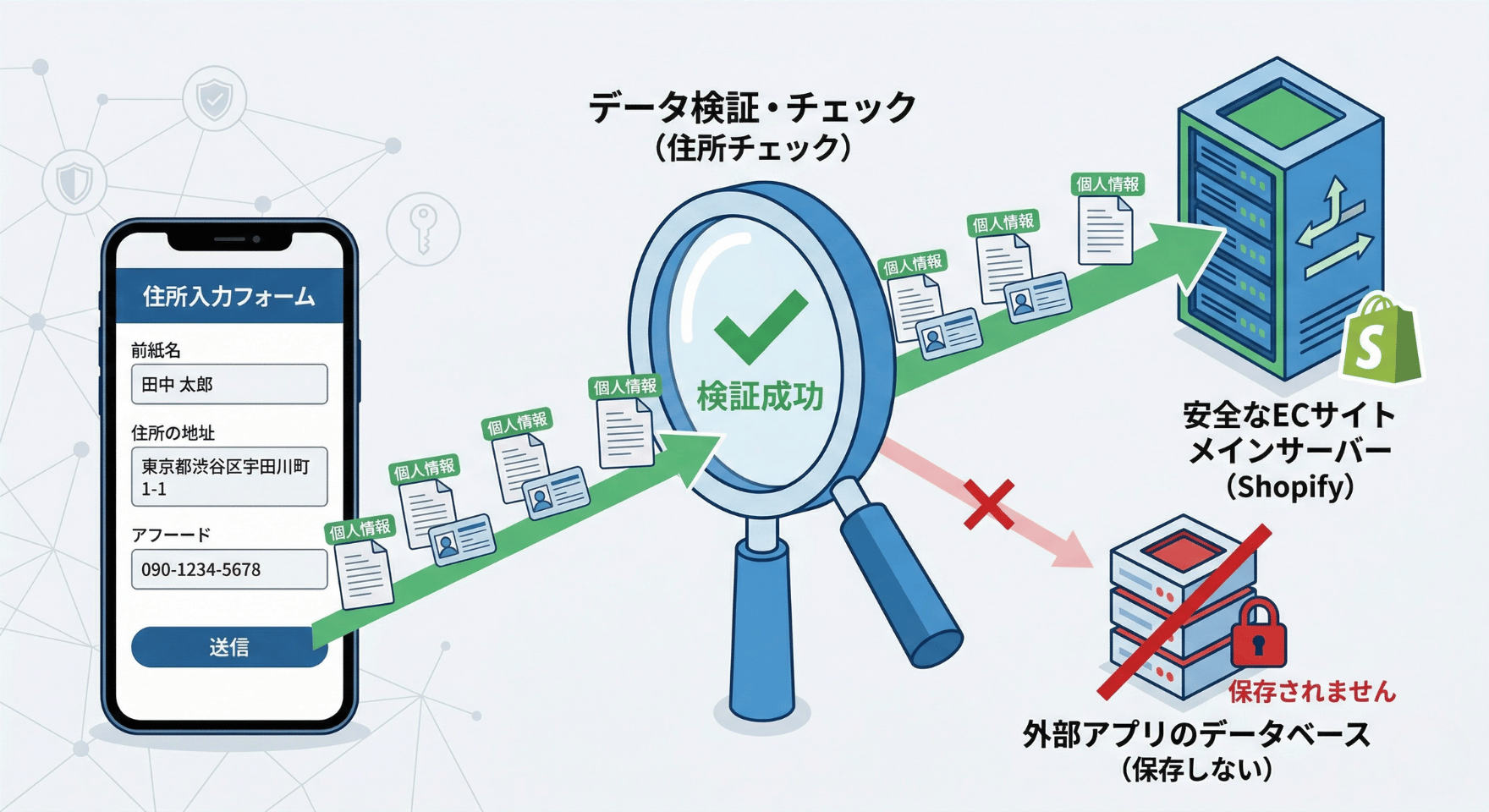 個人情報保護法第22条では、利用する必要がなくなった個人データについて、遅滞なく消去するよう努める考え方が示されています。住所の正しさを一時的に判定し、結果を返した後にデータを残さない仕組みであれば、ガイドラインの指針にも沿いやすくなります。