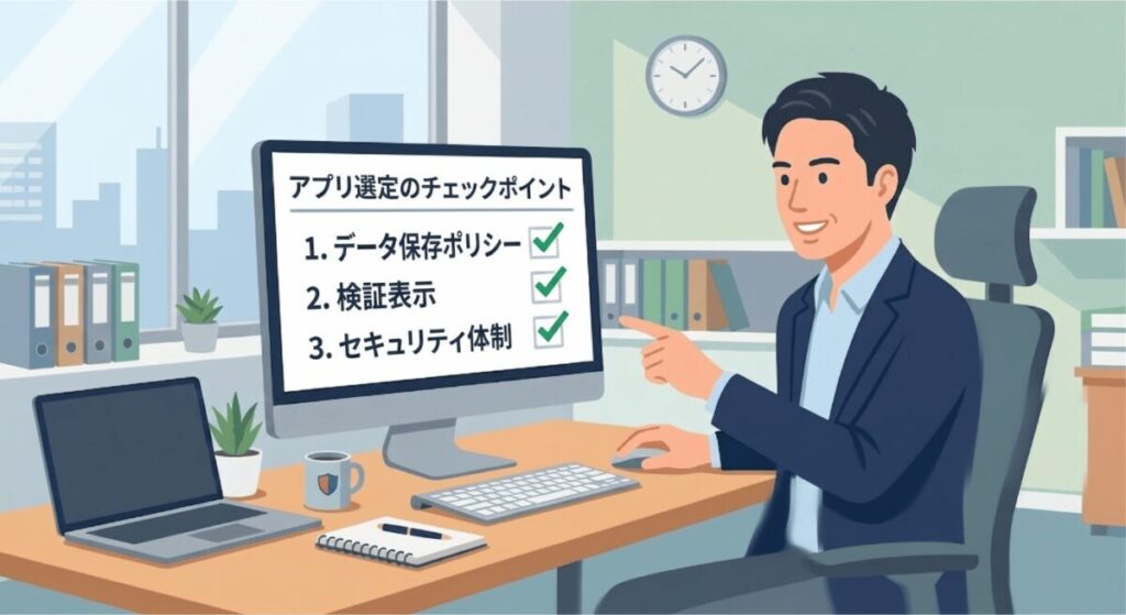 例えば、ISMS認証(ISO/IEC 27001に基づく認証)は判断材料の一つになります。第三者による審査を受けている企業であれば、情報セキュリティを継続的に管理する体制を見極めやすくなります。ただし、認証を取得しているだけで、個々のアプリの安全性が自動的に保証されるわけではありません。保存ポリシーや処理方法まであわせて確認することが大切です。