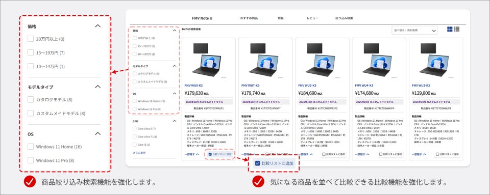 メモリ容量やストレージなどのスペックで商品を絞り込める検索機能や、気になる複数の商品を一画面で並べて比較できる比較機能が強化されます。また、選択した商品やスペック情報をカートに保存できる機能が新たに追加されます。一度選んだ内容を保持したまま再訪問できるため、再度一から選び直す手間が省け、じっくり検討したうえでスムーズな購入が可能になります。