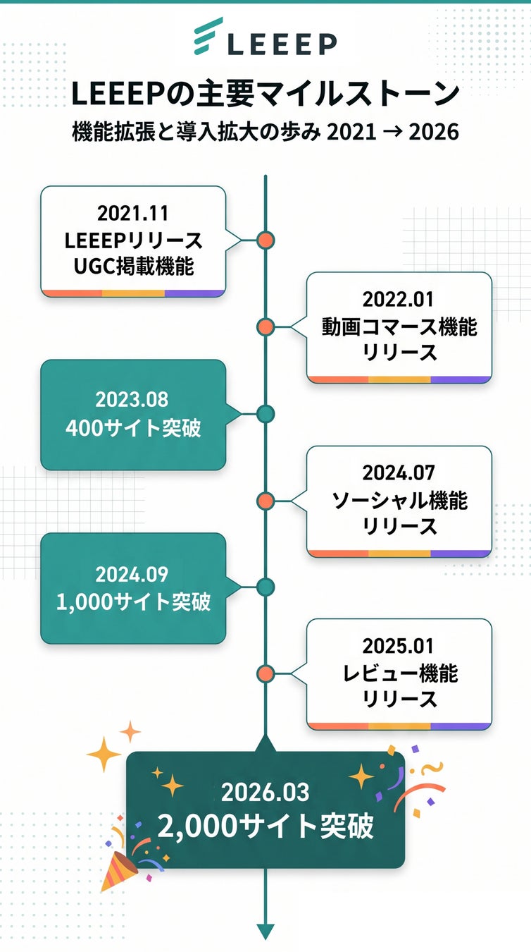 LEEEPは2021年11月のサービス提供開始から、UGC掲載機能を中心に据えながら、動画コマース機能、ソーシャル機能、レビュー機能へと段階的に展開を進めてきました。こうした機能拡張により、ブランドの魅力や世界観、商品の信頼性をより自然な形で伝えるEC体験の実現をサポートしてきました。今回の2,000サイト突破という成果は、LEEEPがECサイト上における多様な顧客接点を支える統合プラットフォームとして、着実に普及してきたことを示す重要なマイルストーンとなっています。