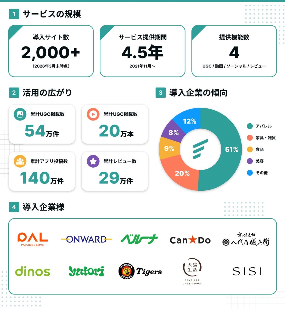LEEEPのこれまでの成長を主要な数値で振り返ると、その実績の大きさが明らかになります。2021年11月のサービス開始から約4年半の期間で導入サイト数は2,000を突破し、累計では54万件を超えるUGCや20万本を超える動画がECサイト上に掲載されてきました。業種別の内訳を見ると、アパレルが全体の約半数を占めており、そのほかにも食品、美容、インテリアなど幅広い業界で活用されています。