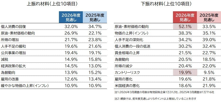 上振れ要因は「個人消費の回復」、下振れ要因は「原油・素材価格の動向」がトップ