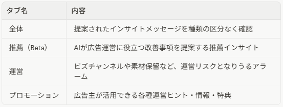 広告運営の現況をもとに、広告管理に役立つインサイトを提案する機能です。
