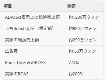 具体例として、ADVoostで約1,200万ウォンの転換売上が表示されていたケースでは、そのうちBoost Up分が約920万ウォンを占めており、実際の転換売上は約290万ウォンしかありませんでした。