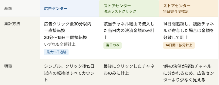 結論から言うと、広告センターとストアセンターは集計基準が異なるため、比較は不可能とのことです。