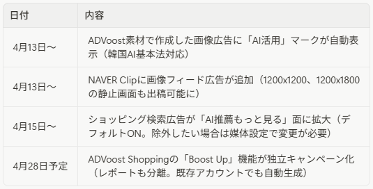 - 4月以降の連続拡張の起点 — AI推薦面への広告拡大、NAVER Clip対応、Boost Up独立キャンペーン化など、3月30日を起点に連鎖的なアップデートが続いています。
