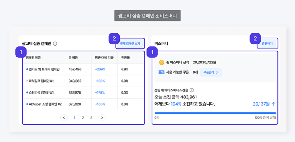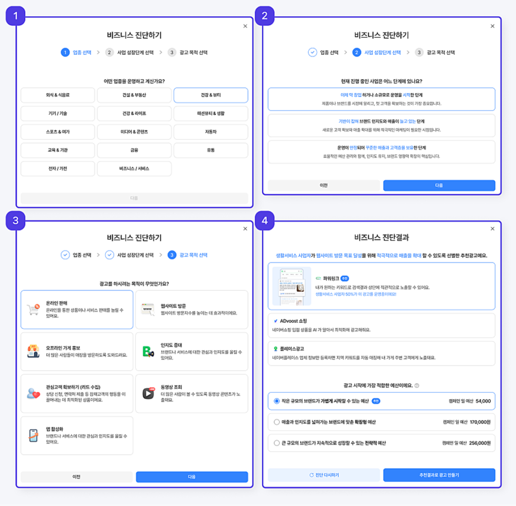 より直感的な広告管理のために、成果要約ダッシュボード、業種・目的ベースの広告推薦機能(ビジネス診断)、そして簡易広告登録が新たに導入されました。複雑な設定をしなくても、適切なキャンペーンを簡単に開始・管理できるよう設計されています。