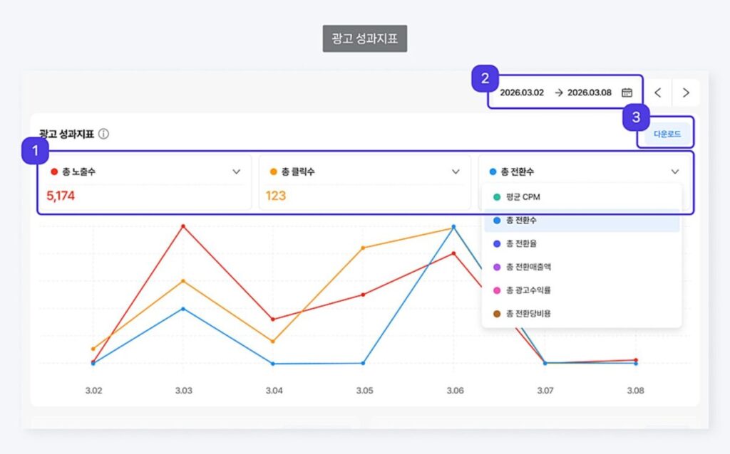 希望する広告成果指標を3つ選択して表示できます。指標名をクリックすれば他の指標に変更可能です。変更可能な指標は左側の領域から順に異なります。