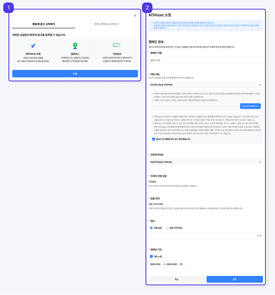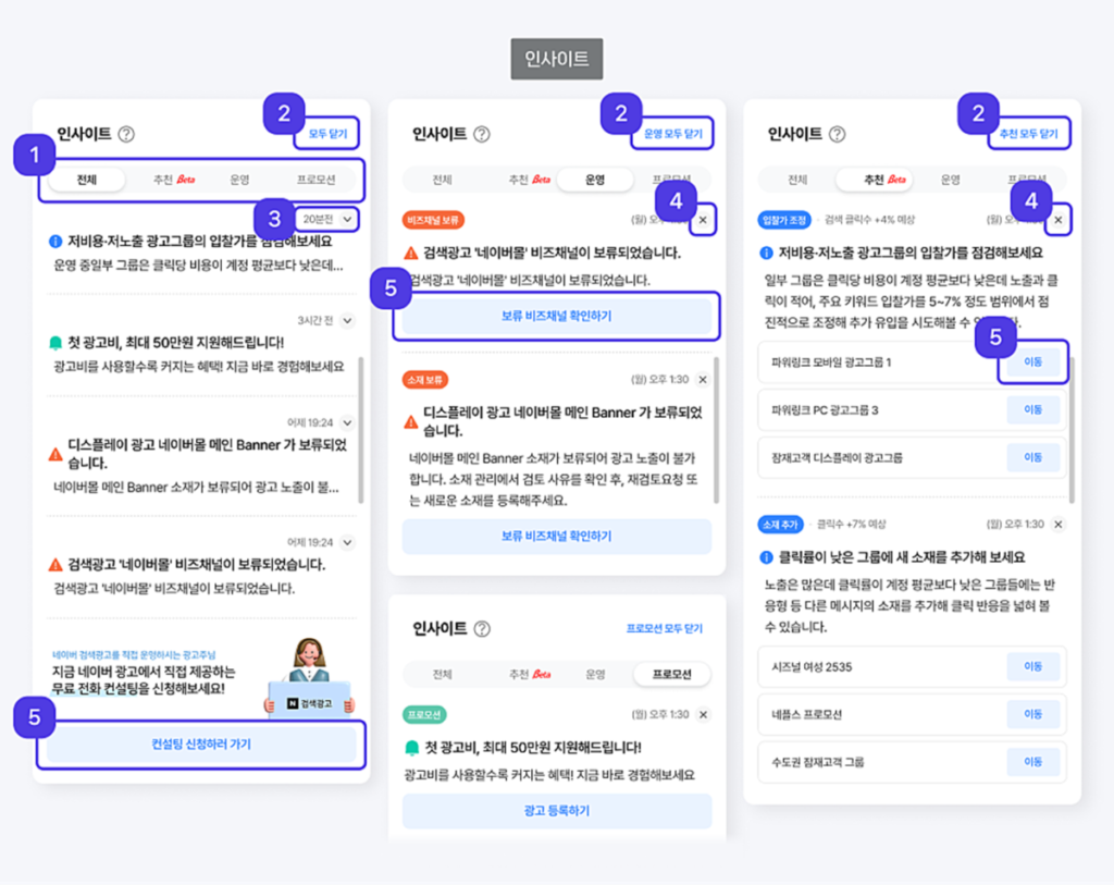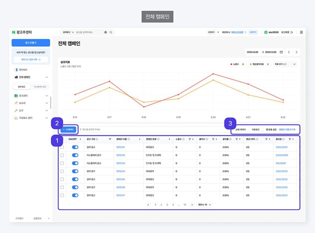 - 構造レベルの変更 — 検索広告とディスプレイ広告が1つの広告主センターに統合されました。これは単なるUI改善ではなく、NAVER広告のアーキテクチャそのものの変更です。