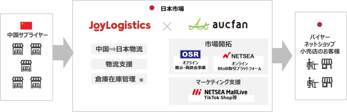 オークファングループとJoyLogistics(京東物流)の協力体制により、中国サプライヤー企業の商品を日本国内の小売事業者へ流通させる仕組みを整備していくことになるとのことです。