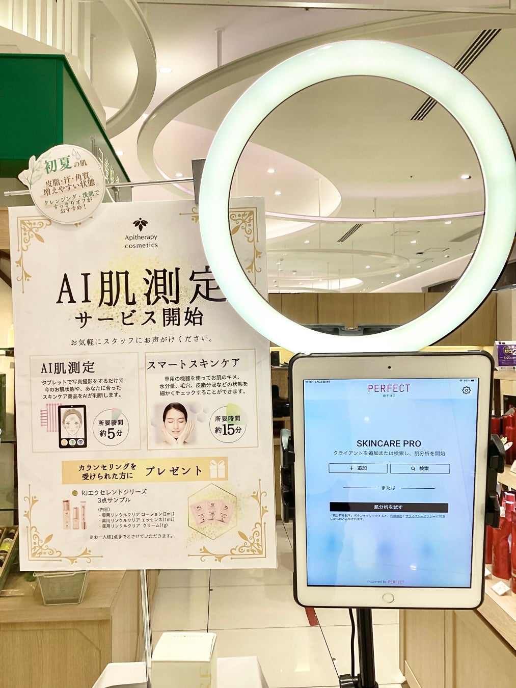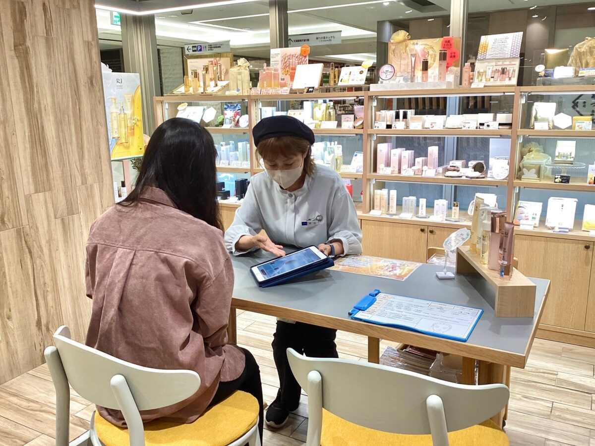 山田養蜂場では、AI肌診断ツール「スキンケアプロ」をタブレット端末に搭載する形で導入しており、2つの店舗では常設での運用を行っています。また、その他の店舗においては、イベント開催時などに活用するという形態をとっています。