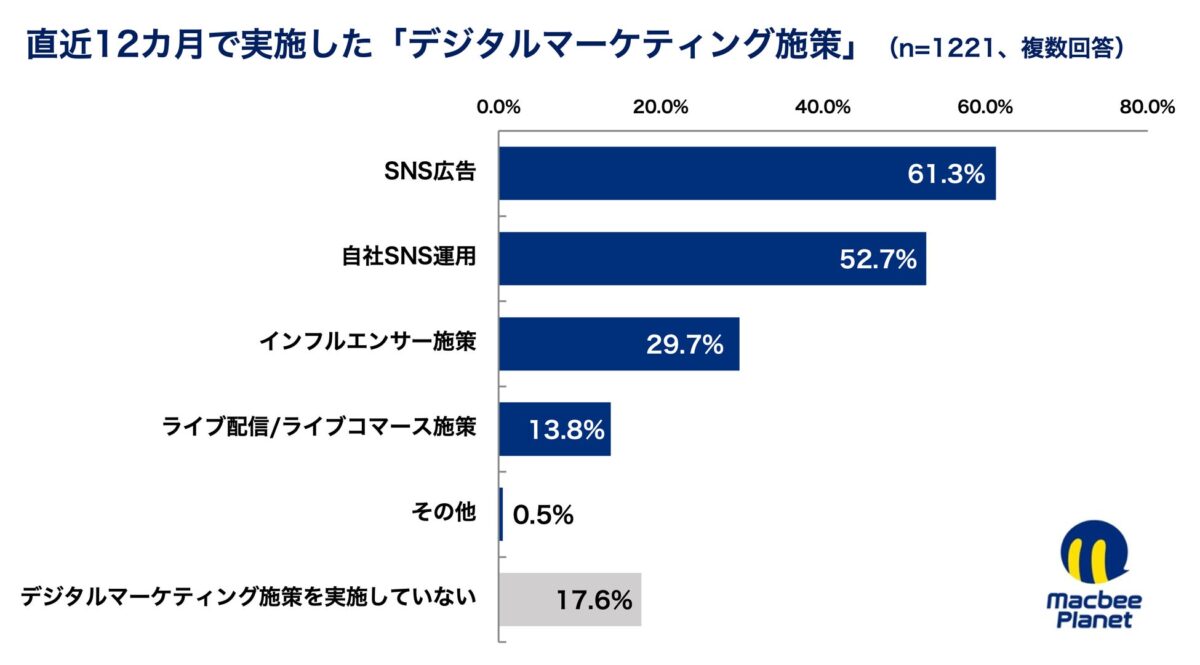 直近12カ月のデジタルマーケティング施策の実施状況を確認すると、SNS広告は61.3%、自社SNS運用は52.7%に達しており、すでに過半数の企業が実施していることが明らかになりました。一方で、インフルエンサーマーケティングは29.7%にとどまっており、SNS関連施策の中でも全社的に定着しているとは言い切れない状況です。SNS広告や自社SNS運用が主流化している一方で、インフルエンサーマーケティングは企業ごとの運用知見や評価方法の差が表れやすい領域となっています。