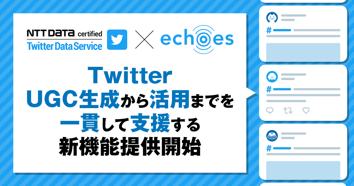 業界情報・プレスリリース echoes、「Twitterデータ提供サービス(インテグレーション)認定サービスプログラム」の認定を受け、TwitterのUGC生成から活用まで一貫して支援する新機能を提供開始 2022年12月12日 企業のマーケティングDXを支援するアライドアーキテクツ株式会社(東京都渋谷区、代表取締役社長 CEO:中村壮秀、証券コード:6081)でSaaS事業を展開するプロダクト...