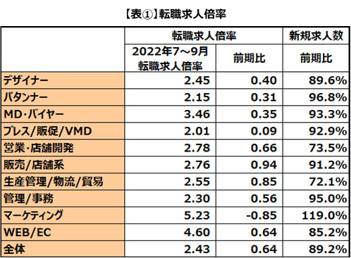 業界情報・プレスリリース アパレル・ファッション業界の「転職求人倍率」(2022年7~9月期)を発表調査開始以降初めて、転職求人倍率が2倍越え 2022年11月15日 転職サービス「doda(デューダ)」などを提供するパーソルキャリア株式会社が運営する、アパレル・ファッション業界専門の転職支援サービス「クリーデンス」は、2022年7~9...