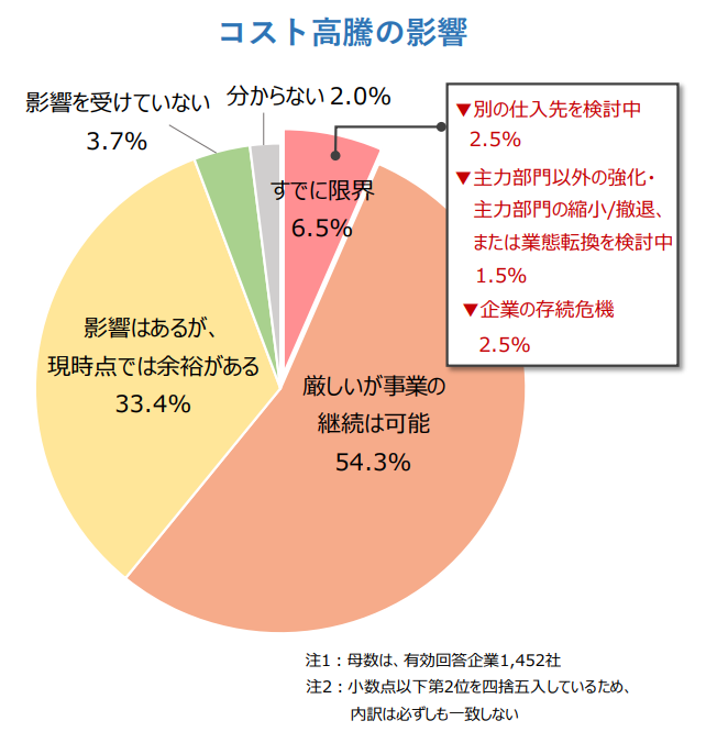 業界情報・プレスリリース コスト高騰で6.5%が「すでに限界」、うち2.5%は企業の「存続危機」 半数超は事業継続が可能も「厳しい」 2022年11月15日 原材料費や光熱費、輸入コストなど、企業におけるさまざまなコストの高騰が続いているなか、帝国データバンクが実施した調査 によると、コストの上昇分を販売価格に全く転嫁できてい...