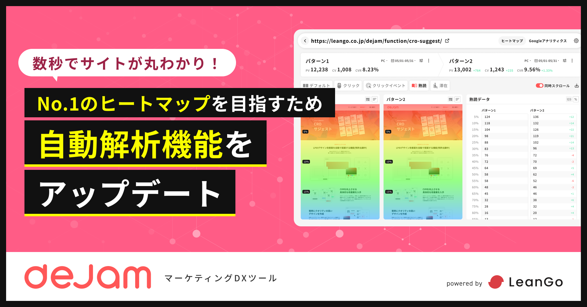 業界情報・プレスリリース マーケティングDXツール「dejam」、ヒートマップ機能で独自の自動解析機能をアップデート 2023年5月17日 株式会社LeanGo(本社:東京都目黒区、代表取締役:平井 翔吏 以下 弊社)は、自社の運営する「dejam」において、Webマーケターに人気のヒートマップ機能で独自の自...