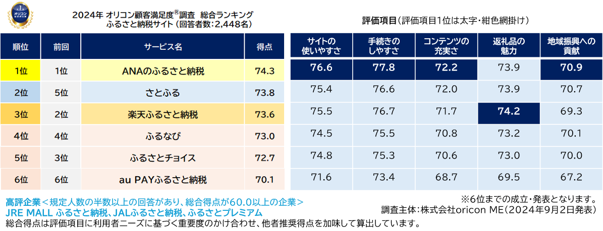 業界情報・プレスリリース oricon ME -実際の利用者が対象-満足度の高い『ふるさと納税サイト』ランキング┃【ANAのふるさと納税】が2年連続3度目の総合1位(オリコン顧客満足度®調査) 2024年9月2日 実際のサービス利用者のみを対象に、第三者の立場で顧客満足度調査を実施する株式会社oricon ME(本社:東京都港区 代表取締役社長:小池 恒 略称:オリコン)は、『ふる...