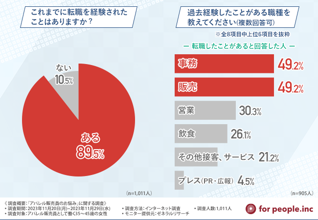 業界情報・プレスリリース フォーピープル 「アパレル販売員のお悩み」調査 アパレル販売員の7割が自分のキャリア形成に迷いがあったと回答!その理由とは? 2024年1月26日 株式会社フォーピープル(所在地:東京都渋谷区、代表取締役:田中 弘武)は、アパレル販売員として働く35〜45歳の女性を対象に、「アパレル販売員のお悩み」に関する調査を実施...