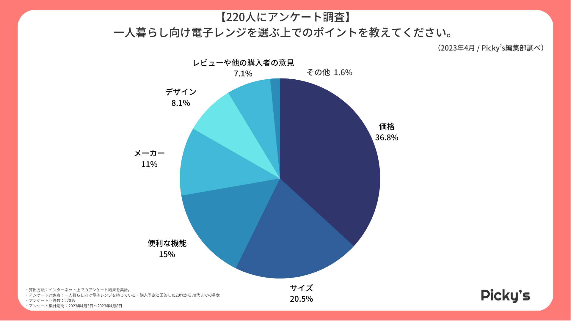 業界情報・プレスリリース 【220人にアンケート】一人暮らし向け電子レンジはどう選ぶ?選ぶうえでのポイントや価格帯、メーカーを調査 2023年5月2日 おすすめ比較サイト「Picky's」を運営する株式会社rentryがインターネット調査を実施し、春の新生活に先駆けて一人暮らし向け電子レンジに関するアンケート結果を発表し...