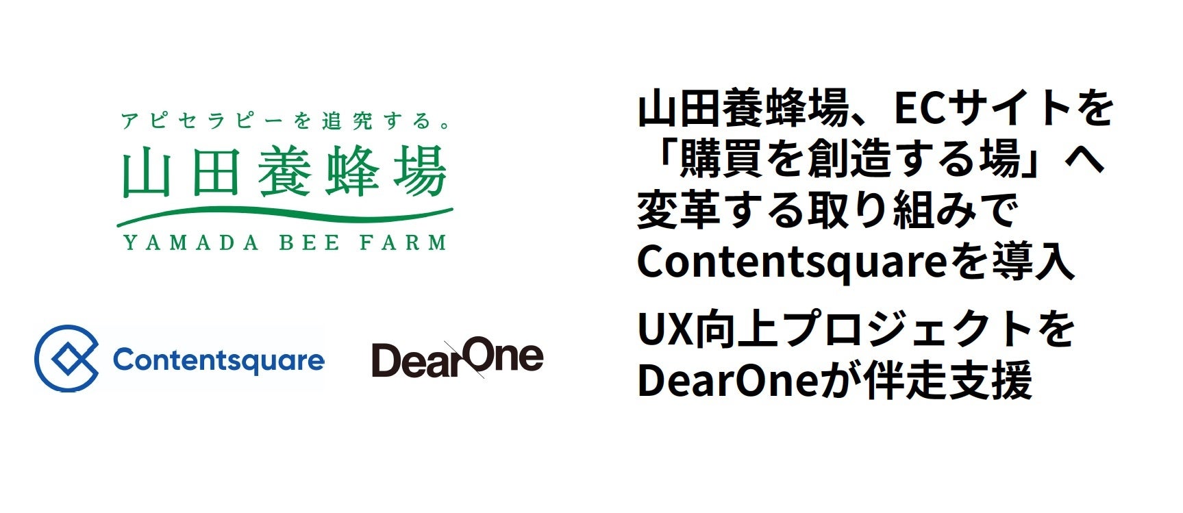 業界情報・プレスリリース DearOne山田養蜂場Contentsquare Japan 山田養蜂場、ECサイトを「購買を創造する場」へと進化させる取り組みの中でContentsquareを導入 日々変化するお客さまの購買行動に対し、根拠に基づいた施策で改善を加速 2024年5月27日 Contentsquare(本社:仏パリ、読み:コンテンツスクエア)と株式会社NTTドコモのマーケティング分野における新規事業型子会社である株式会社DearOne(本社:...