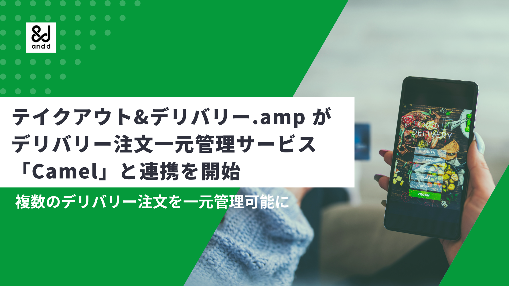 業界情報・プレスリリース コマースメディアand.dtacoms Shopifyアプリ「テイクアウト&デリバリー .amp」全国8,000店舗以上が導入するデリバリー注文一元管理サービス「Camel」と連携開始 2023年12月13日 「いいモノゴトをおこす」をテーマに、Eコマース領域でアプリ開発事業を展開する株式会社and.d(本社:東京都町田市 代表取締役:深澤 大気、以下and.d)は、コマースメ...